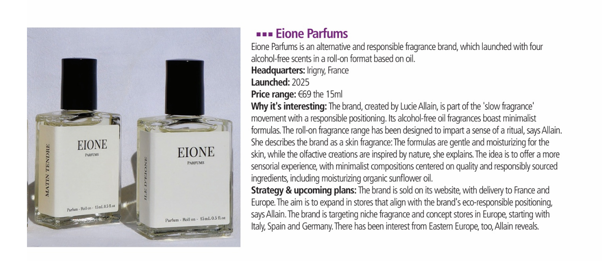 "the brand is part of the "slow fragrance" movement with a responsible positioning. Its alcohol-free oil fragrances boast minimalist formulas."